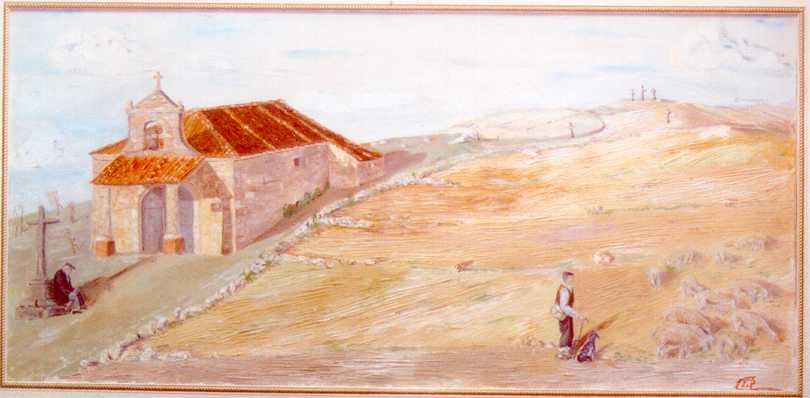 Vista del entorno de la ermita animada con dos personajes que, sin saber a ciencia cierta quienes son, lo suponemos: el pastor es Justo Matías y el anciano doblado sobre sí mismo en la cruz del calvario es el señor Benjamín, padre de Carmen y Manola.